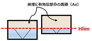 (1)As 計算を行う排煙窓の排煙に有効な部分の面積(As)です。排煙に有効な部分とは限界煙層高さ(Hlim)より上の部分になります。Hlimが排煙窓の境界にある場合はHlimより上の部分のみAs対象の面積とみなします。